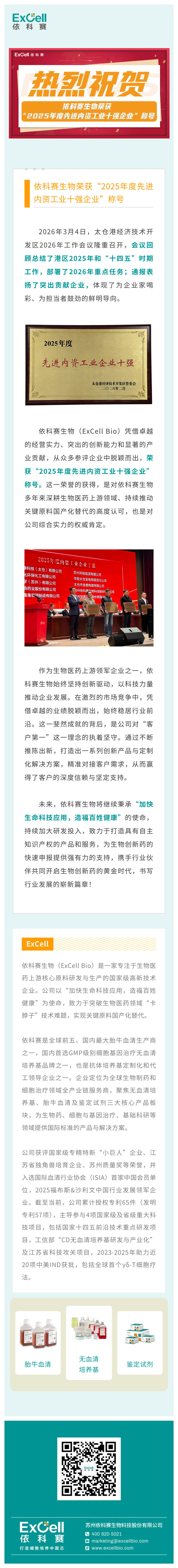 喜报 | 依科赛生物荣获“2025年度先进内资工业十强企业”称号