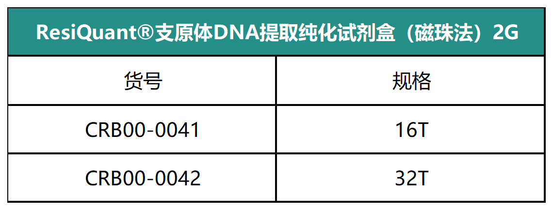 ResiQuant®支原体DNA提取纯化试剂盒(磁珠法)2G通过样本预处理操作和磁珠特异性结合,有效降低细胞及样本基质的干扰,可提取纯化生物样品中的微量支原体DNA。提取步骤简单,仅需30~45分钟,与ResiQuant®支原体检测试剂盒(荧光探针qPCR法)(CAT. CRB00-1011/CRB00-1012)配套使用,可达到快速检测支原体的目的。