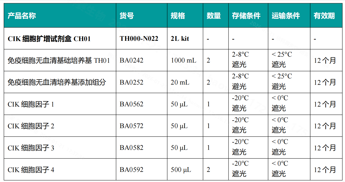 CIK 细胞扩增试剂盒 CH01 是一款专为 CIK(cytokine-induced killer)细胞培养而设计的无血清、无异源动物源成分的培养基套装,包括免疫细胞无血清基础培养基 TH01、免疫细胞无血清培养基添加组分、CIK 细胞因子 1、 CIK 细胞因子 2、CIK 细胞因子 3、CIK 细胞因子 4。此套装适用于人外周血淋巴细胞(PBMCs)以及脐带血淋巴细胞(CBMCs)中 CIK 细胞的诱导活化培养,培养过程需额外添加热灭活自体血浆或商业化人血小板裂解物。